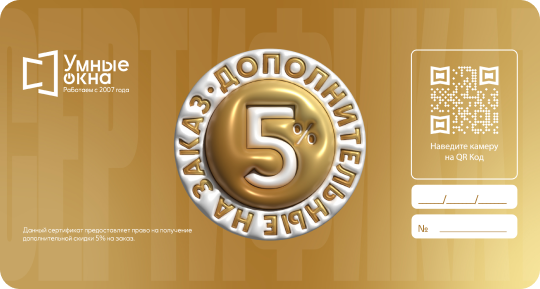 Дополнительная скидка 5% за рекомендацию при новом заказе. Золотой купон, который вручается индивидуально лучшим заказчикам через менеджера или замерщика.